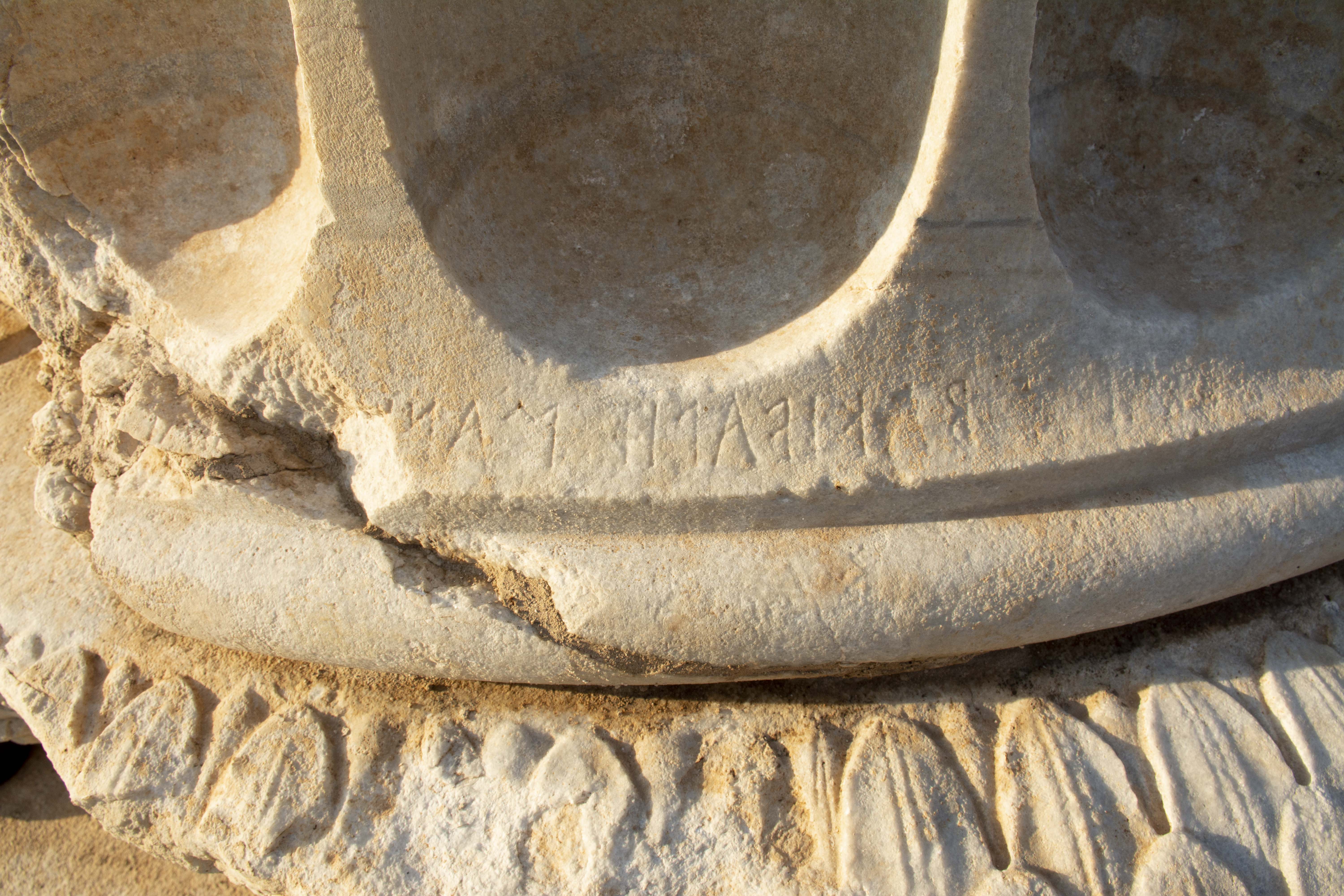 Base of unfinished Roman column 4, with wreath and inscription. (©Archaeological Exploration of Sardis/President and Fellows of Harvard College)