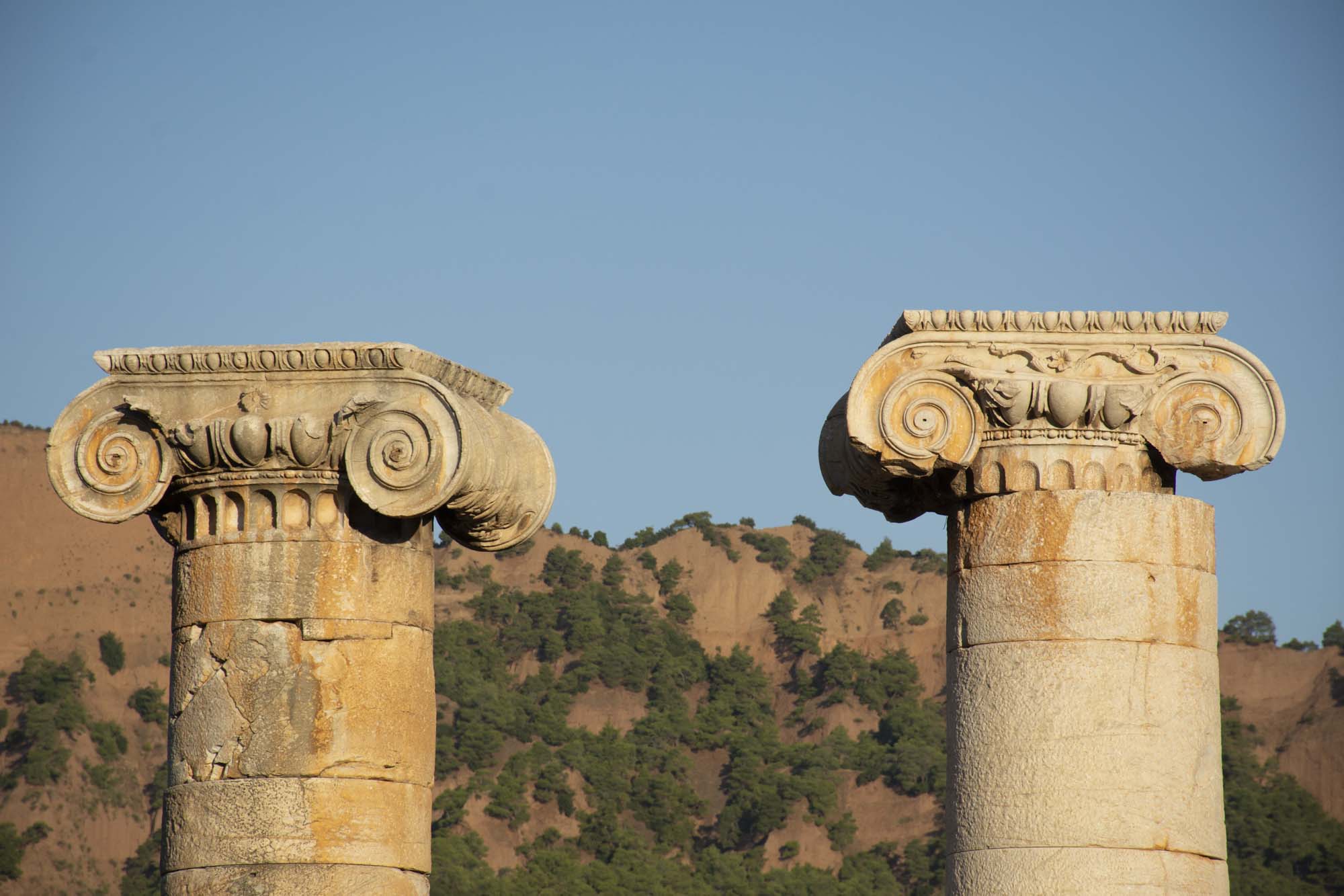 This temple, one of the largest in the world, was originally dedicated to Artemis. It faced west like other Anatolian temples of Artemis such as those at Ephesus and Magnesia (figs. 1, 2, 3, 4, 5, 6, 7, 8, 9, 10; see also drone videos in Wings over Sardis). The two complete columns have stood intact since antiquity and have never been restored (fig. 11).