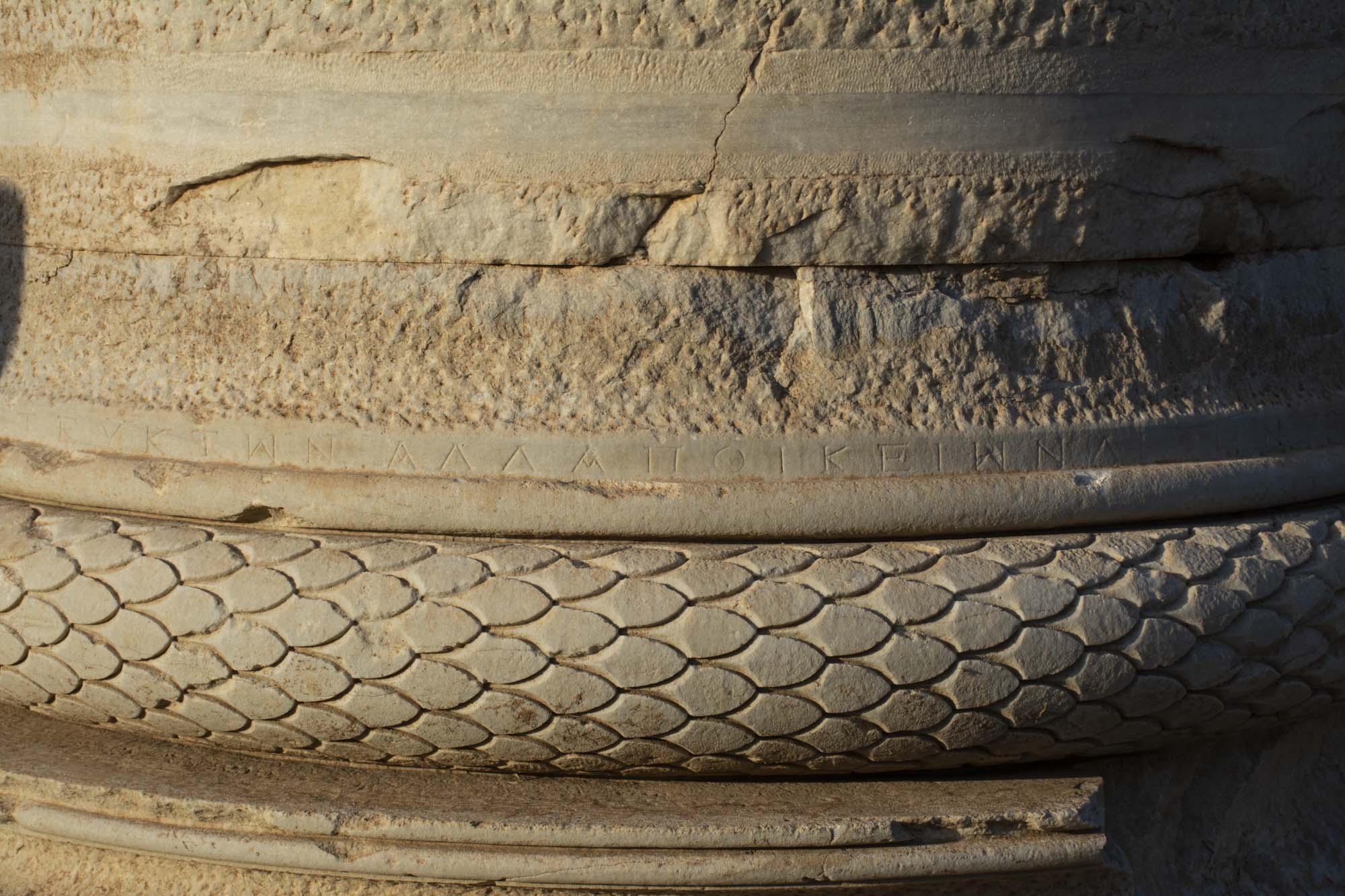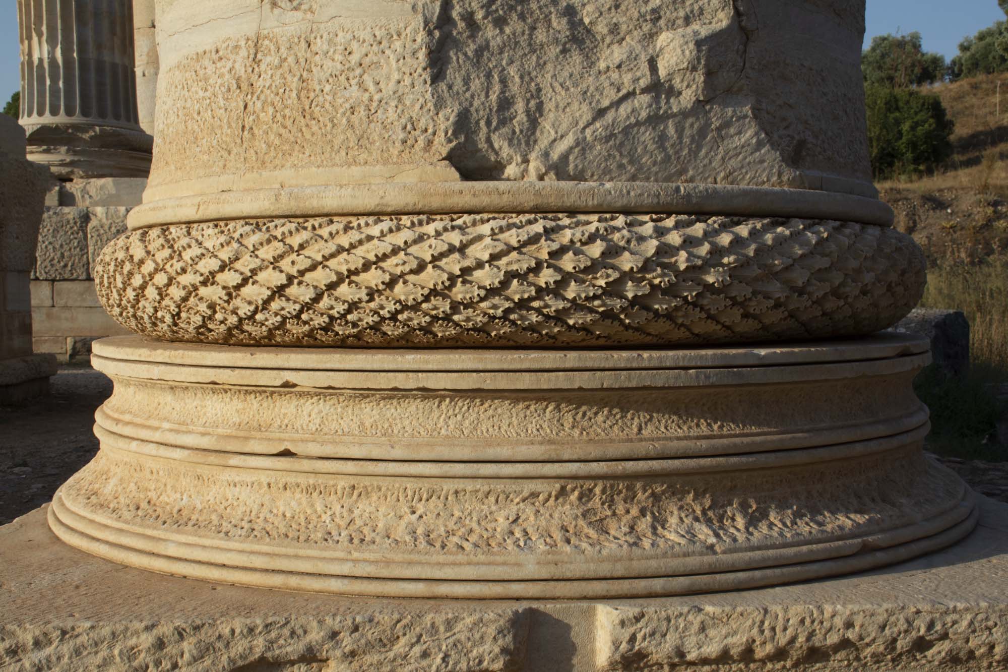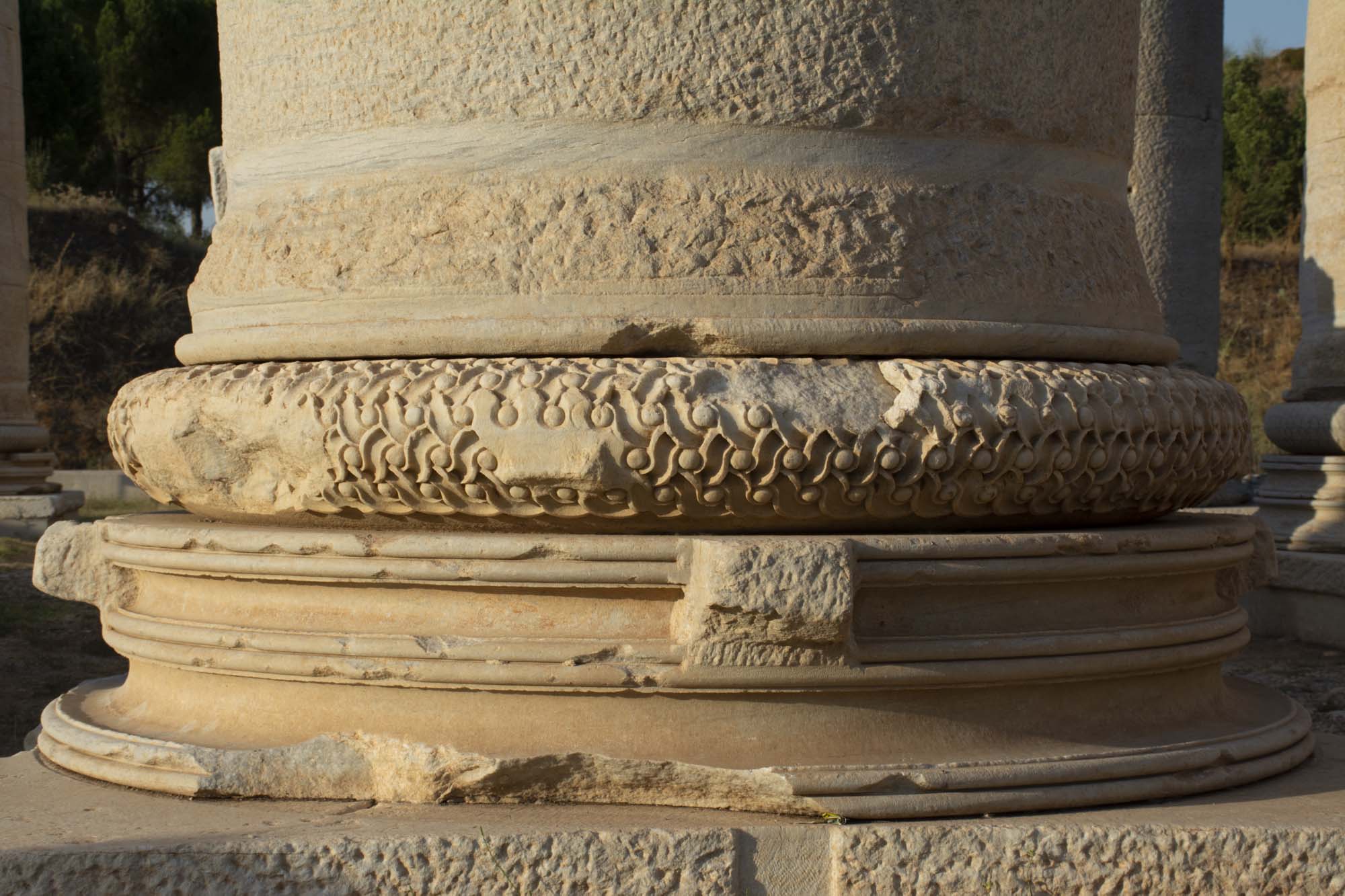 Column bases are the so-called Asiatic Ionic type, consisting of torus and scotia members. Only those on the high pedestals are completely finished, as these are Hellenistic bases reused from elsewhere in the building (figs. 45, 46, 47). Finished and partly-finished torus members are carved with braid (guilloche) and overlapping leaf (imbrication) patterns; which were common decorative motifs and probably had no symbolic meaning (figs. 46, 47). On column 6, oak leaves are carved with acorns and small creatures (e.g., salamander, scorpion, snail) (figs. 48, 49). On column 4, the leaf pattern belongs to a wreath, with leaves diverging from a ribbon at the back (west) and converging on an appliqué star or rosette, attested by attachment socket holes, at the front (east) (fig. 50). An inscription encircles the column (below).
